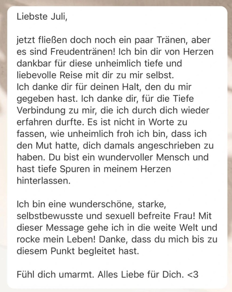 Ich habe mich in jeder einzelnen Session sooo gesehen, gefühlt und gehalten gewusst. Bei jeder “Übung”, bei jedem “Tool” (das sind keine passenden Worte für das, was wir in den Sessions bewegt haben) habe ich mich so sicher gefühlt, weil du mit deiner Intuition und deinem offenen, neugierigen (positiv!), achtsamen Geist so viel “herausgekitzelt” hast. Durch Fragen, so on point, dass sie eben nicht geskripted sind, sondern intuitiv fließend. Durch deine Präsenz. Durch dein Wesen, dein Sein. […] dann auch noch in Verbindung mit deinem Kurs “Meine Sexualität” – was eine kraftvolle Kombination!”