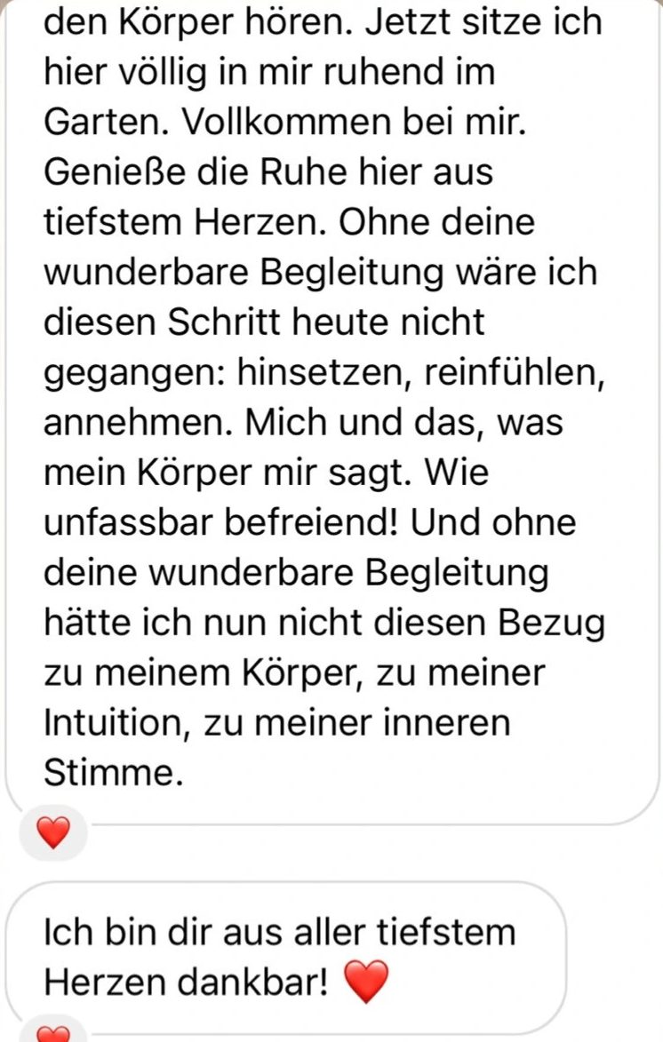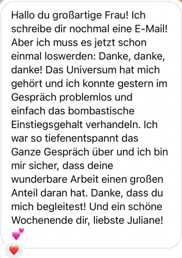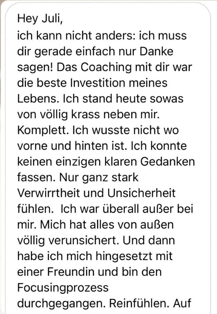 “Ich habe mich für die 1:1 Begleitung von Juli wie gerufen gefühlt. Aber finanziell war es eine große Entscheidung. Nach langem Überlegen habe ich diese Entscheidung “JA” zu sagen, für mich getroffen – weil ich beschlossen habe, es mir Wert zu sein. Und es war genau zum richtigen Zeitpunkt. Von Beginn an, ist etwas Magisches passiert. Ich spürte wie sich mein tiefstes Inneres bewegt. Im Verstand habe ich mein Muster schon lange verstanden und bearbeitet. Allerdings hakte es trotzdem, denn ich wusste nicht wie ich es verändere. Durch die liebevolle, einfühlsame Begleitung von Juli und ihren körperintegrativen Methoden lösten sich so viele Blockaden in mir. Endlich konnte ich mich so annehmen wie ich bin, denn ich habe mich selbst auf einer tiefen Ebene verstanden. Meine Intention hat sich in den 6 Monaten mit Leichtigkeit erfüllt und ich kann es immer noch nicht glauben. Ich bin mir selbst so dankbar, dass ich den Sprung gewagt habe und ich bin Juli unfassbar dankbar, dass sie mich so herzlich und geduldig auf meinem Weg begleitet. Große Herzensempfehlung von mir!! ❤️”